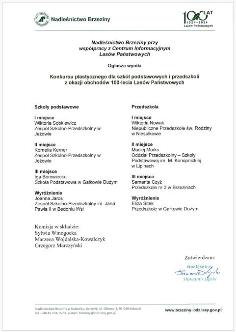 Z przyjemnością informujemy, że wyniki Konkursu plastycznego dla szkół podstawowych i przedszkoli zorganizowanego z okazji obchodów 100-lecia Lasów Państwowych zostały ogłoszone! Konkurs ten, mający na celu przybliżenie dzieciom i młodzieży tematyki związanej z lasami oraz ich ochroną, spotkał się z dużym zainteresowaniem. Dziękujemy wszystkim uczestnikom za przesłanie swoich prac – każda z nich ukazuje wyjątkowe talenty oraz pasję do przyrody.